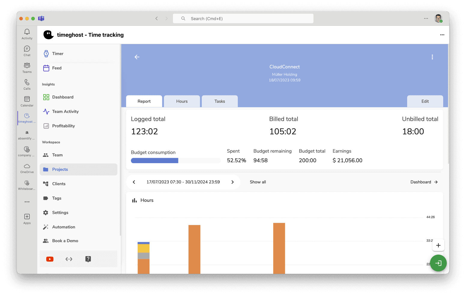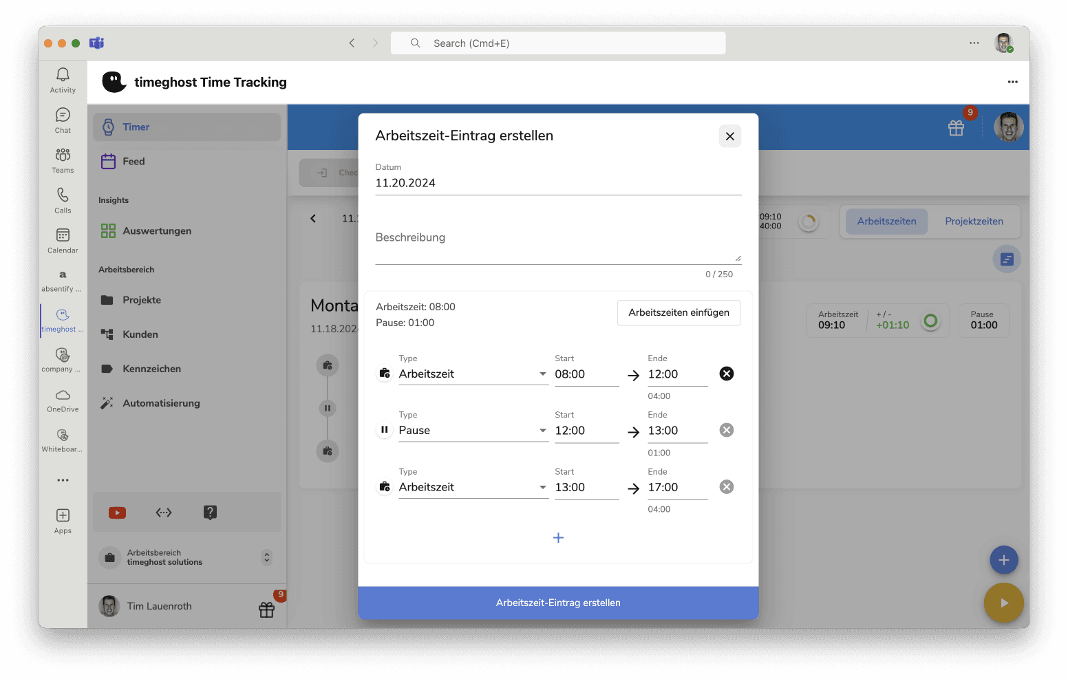 timeghost Time Tracking ist direkt in Microsoft Teams integriert. Du kannst deine Arbeitszeiten per Check-In, Pause und Check-Out erfassen oder Projektzeiten auf Projekte und Aufgaben buchen – alles ohne die Teams-Umgebung zu verlassen.