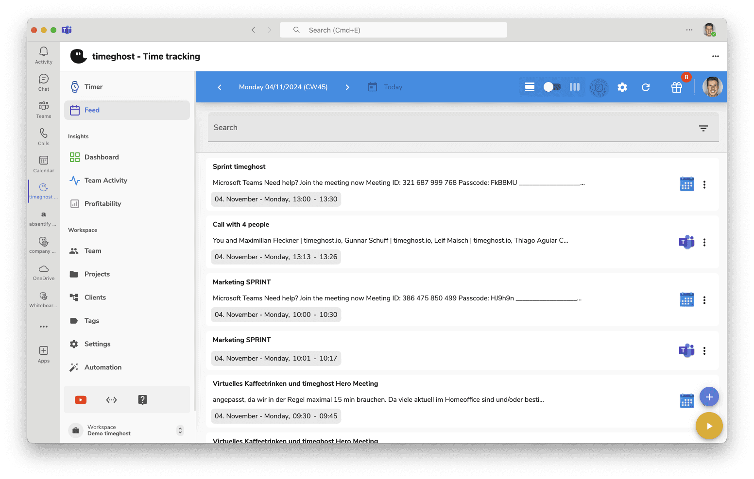 timeghost erkennt automatisch deine Microsoft 365-Aktivitäten – Teams-Anrufe, Outlook-Kalendereinträge, Planner-Aufgaben, Azure DevOps Work Items und mehr. Diese werden dir als Zeitvorschläge präsentiert, die du mit einem Klick als Zeiteinträge buchen kannst. So vergisst du keine Arbeitszeit und sparst dir die manuelle Eingabe.